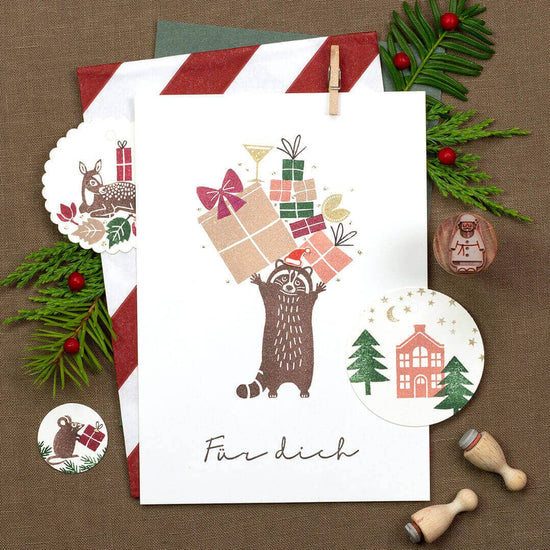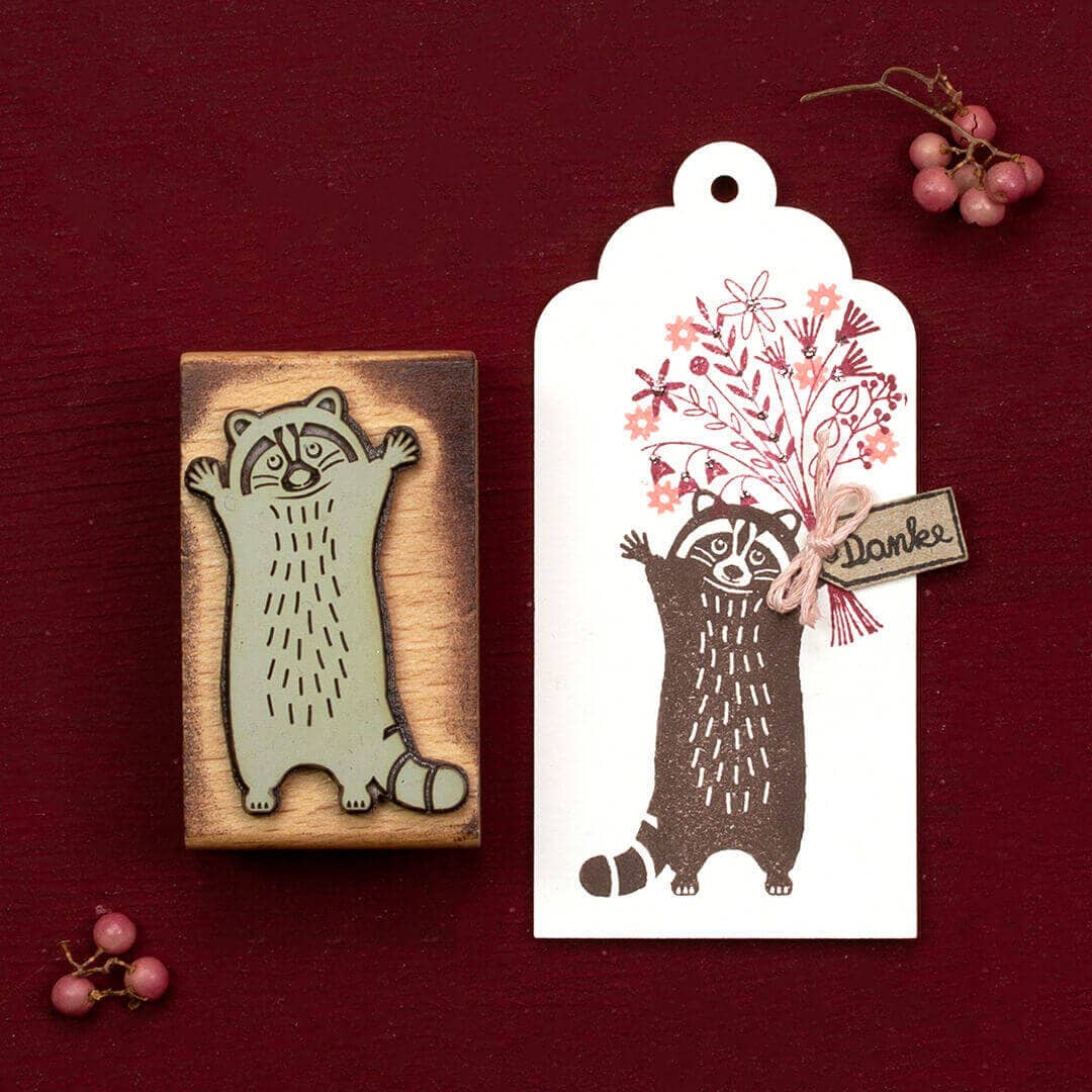 Parce qu’il capture en un geste l’adorable personnalité du raton laveur, avec son museau délicat et son allure rêveuse. Parce qu’il permet mille compositions : entouré de feuilles, posé sur une étiquette, intégré dans une scène forestière… Et parce que comme toujours chez Perlenfischer, la finesse du trait fait toute la différence : un tampon simple, mais d’une grande élégance.