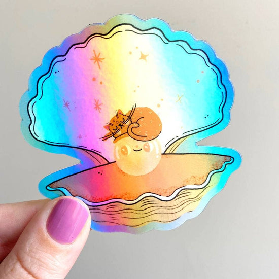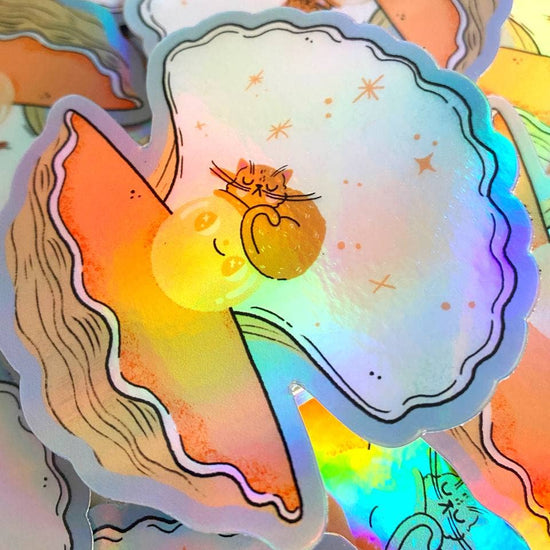 Entre mer et sommeil, cet autocollant holographique imaginé par Bloemkolie capture une scène pleine de douceur : un petit chat endormi dans une huître nacrée, bercé par les reflets changeants de la lumière. Selon l’angle, les couleurs dansent et se transforment — un effet magique qui attire le regard à chaque mouvement.