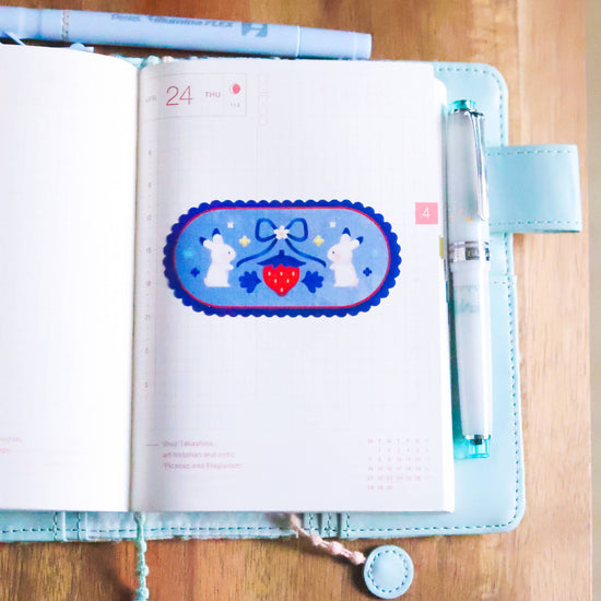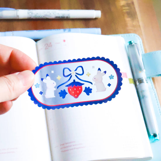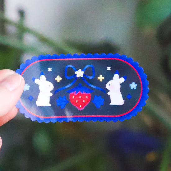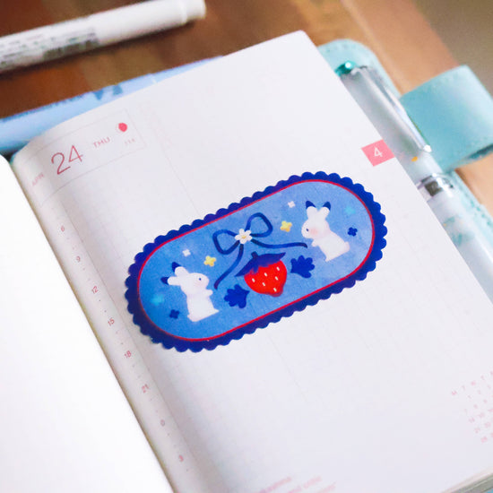 Ce joli sticker met en scène deux petits lapins qui se font face autour d’une fraise ornée d’un nœud, le tout dans une palette bleu tendre qui rappelle les illustrations vintage japonaises. Les contours ondulés et l’effet légèrement texturé donnent une impression de douceur, comme un petit morceau de papier illustré découpé à la main. C’est le genre de détail charmant qui apporte instantanément une touche poétique à un carnet, un agenda ou une enveloppe.