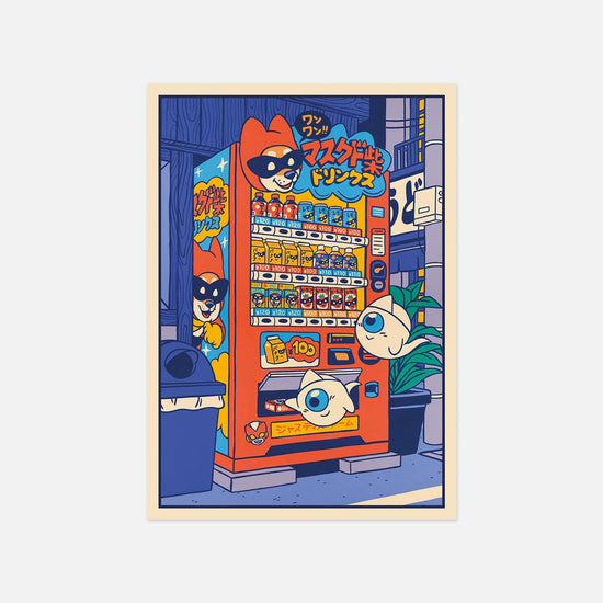 Devant un distributeur de boissons aux couleurs pop de Masked Shiba, ils s’arrêtent pour choisir un jus de fruits. L’ambiance urbaine, les néons, les détails japonais et la palette vibrante donnent à cette illustration une énergie à la fois ludique et cinématographique. Une scène qui capte l’instant, entre gourmandise et exploration nocturne.