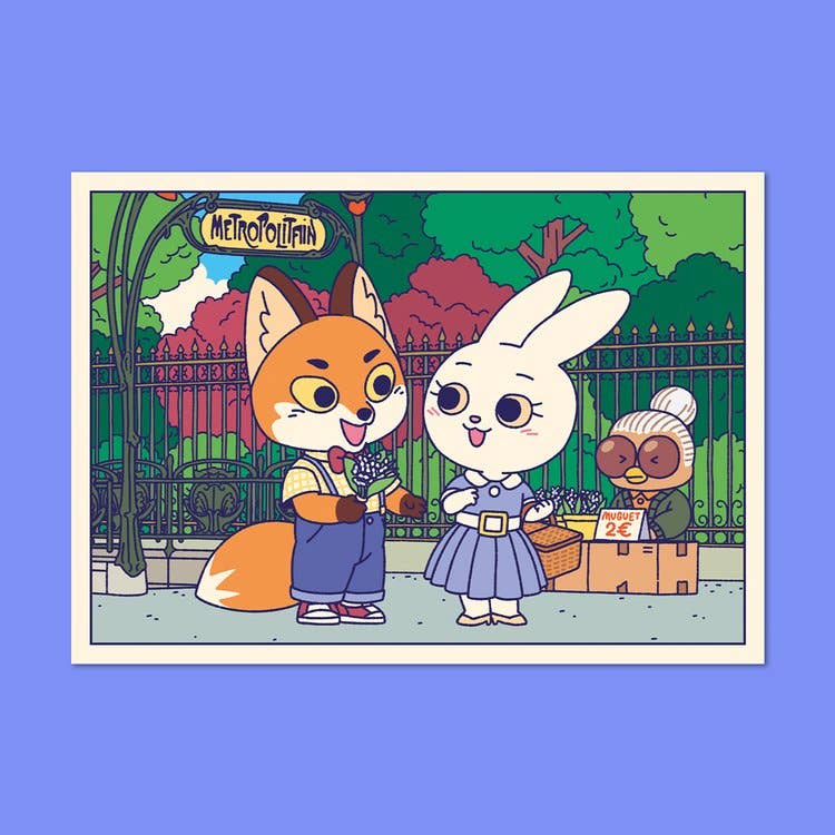 La carte postale « Muguet » met en scène Rémi, personnage original de Yeaaah! Studio, offrant un brin de muguet à Françoise à la sortie du métro. Une scène tendre, inspirée des traditions du 1er mai, où l’on offre du muguet comme symbole de bonheur et de renouveau.