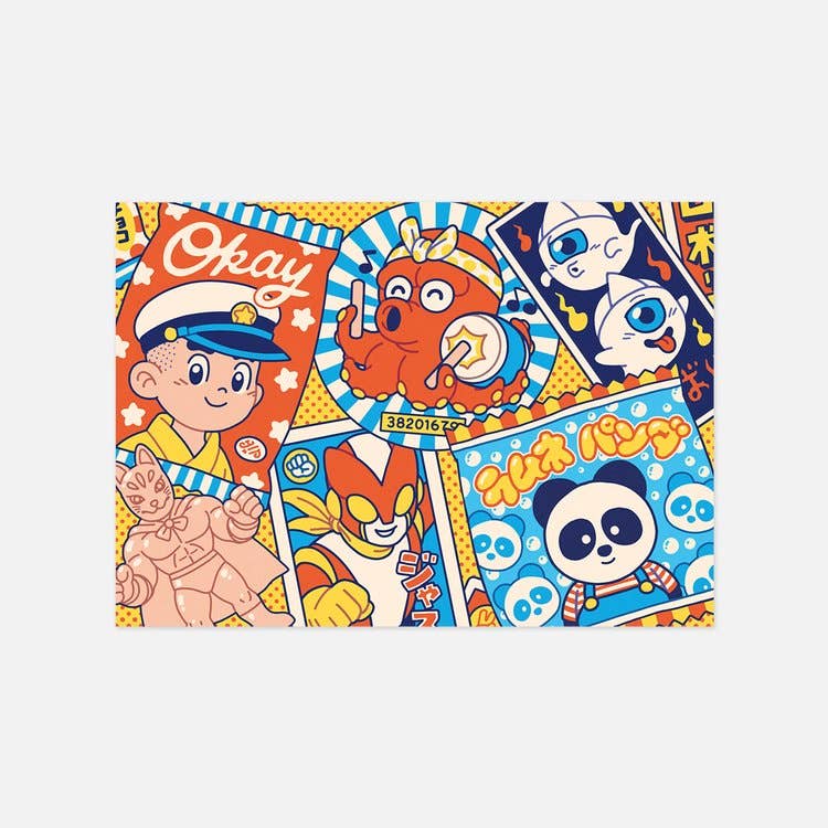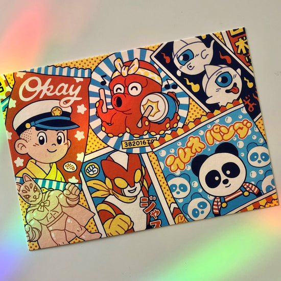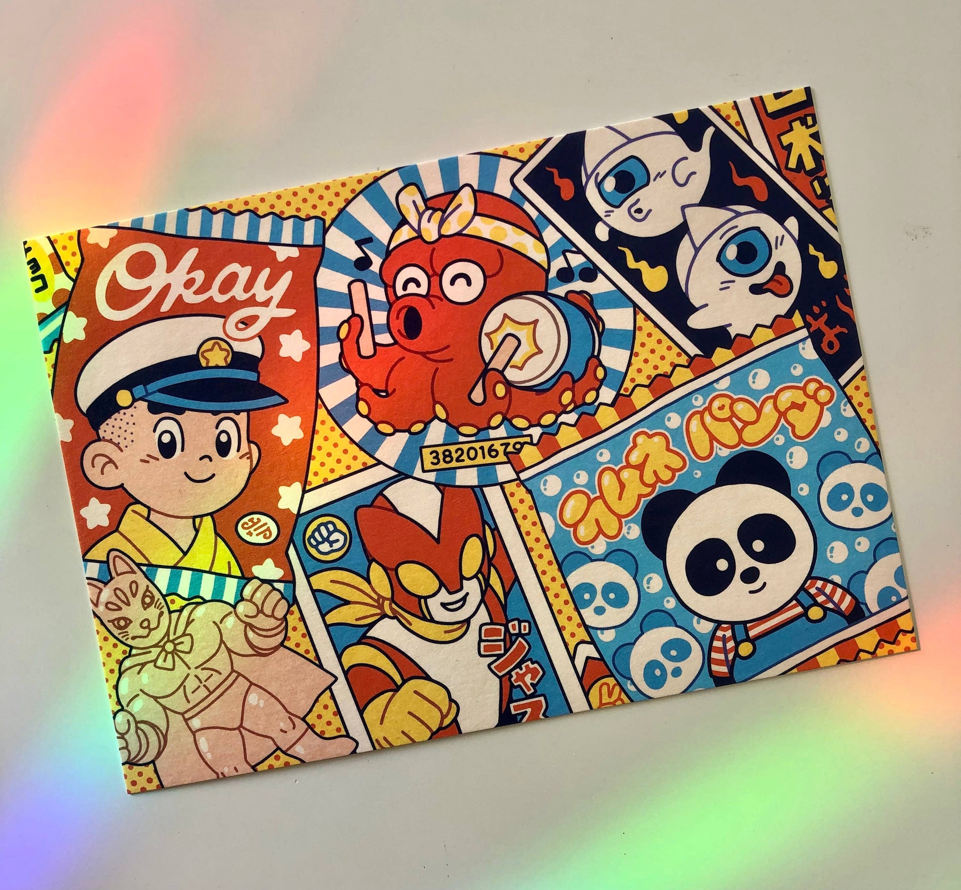 La carte postale « Tokyo Rétro » a été réalisée pour Omiyage Box, une box mensuelle mettant à l’honneur des produits de petites entreprises japonaises, qu’il s’agisse de spécialités locales ou d’objets artisanaux. Pour cette édition sur le thème Tokyo Rétro, l’illustration puise son inspiration dans l’univers des dagashiya, ces boutiques emblématiques de l’ère Shôwa où l’on trouvait friandises et jouets à petits prix.