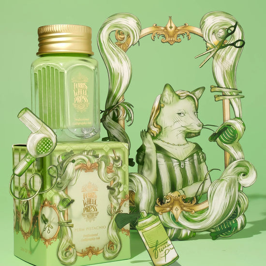 Cette encre vert pistache pastel, douce et opaque, respire la fraîcheur, le renouveau et une élégance légère. Elle évoque les miroirs anciens, les fauteuils confortables et les conversations feutrées autour d’une tasse de thé. Une teinte joyeuse et singulière, parfaite pour célébrer les nouveaux départs, les événements heureux et les créations pleines de charme.