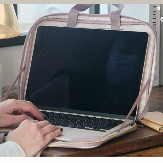Conçue pour accueillir un ordinateur jusqu’à 13 pouces, elle combine praticité et raffinement avec ses couleurs sobres et contemporaines : Charcoal Brown, Dusty Blue et Smocks Pink.