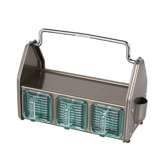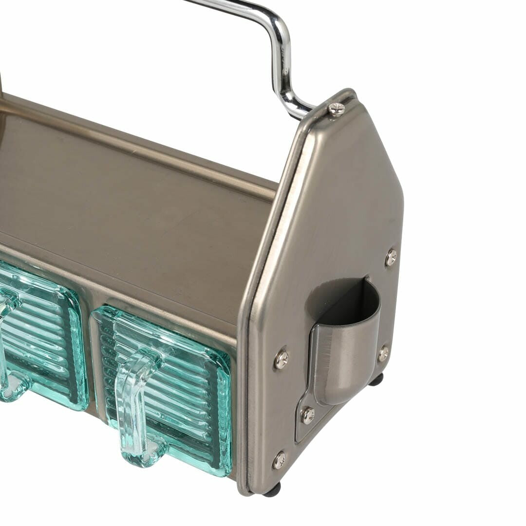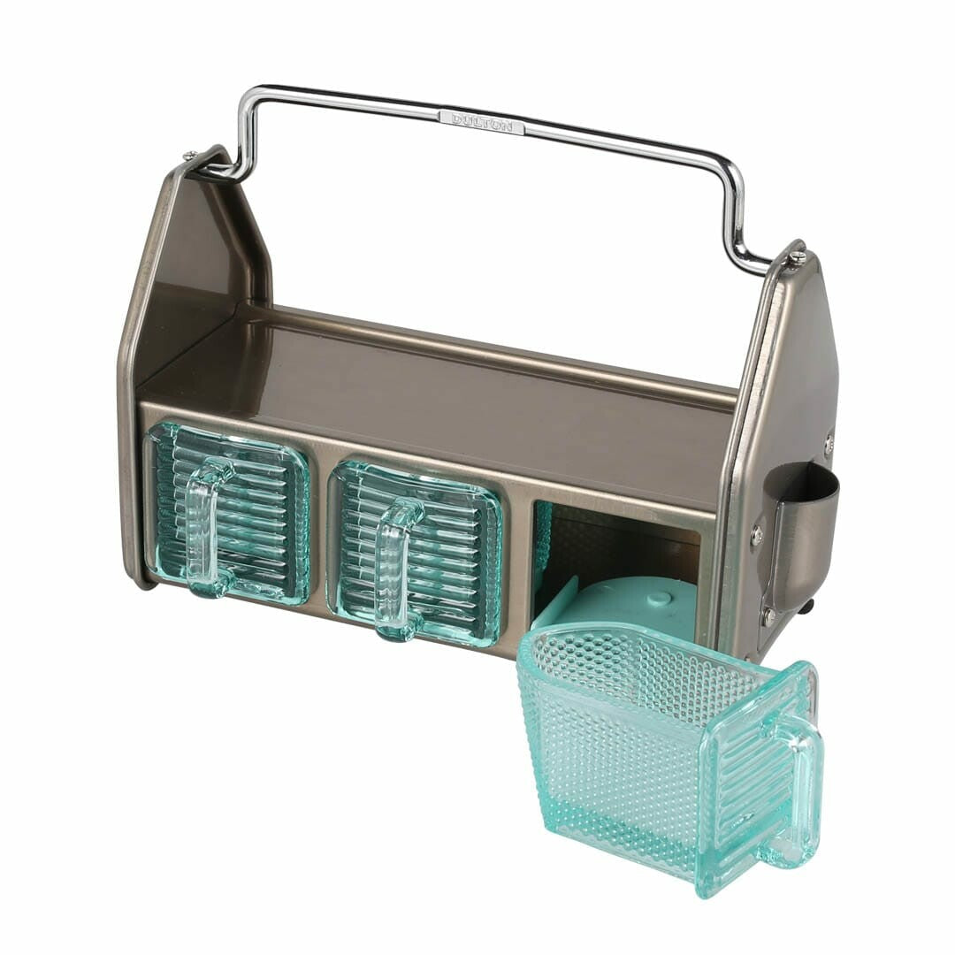 Le contraste entre la structure en acier robuste et les contenants en verre bleuté crée un effet à la fois classique et contemporain, parfait pour ceux qui aiment l’utile et le beau. On l’imagine aussi bien dans une cuisine que dans un atelier créatif.