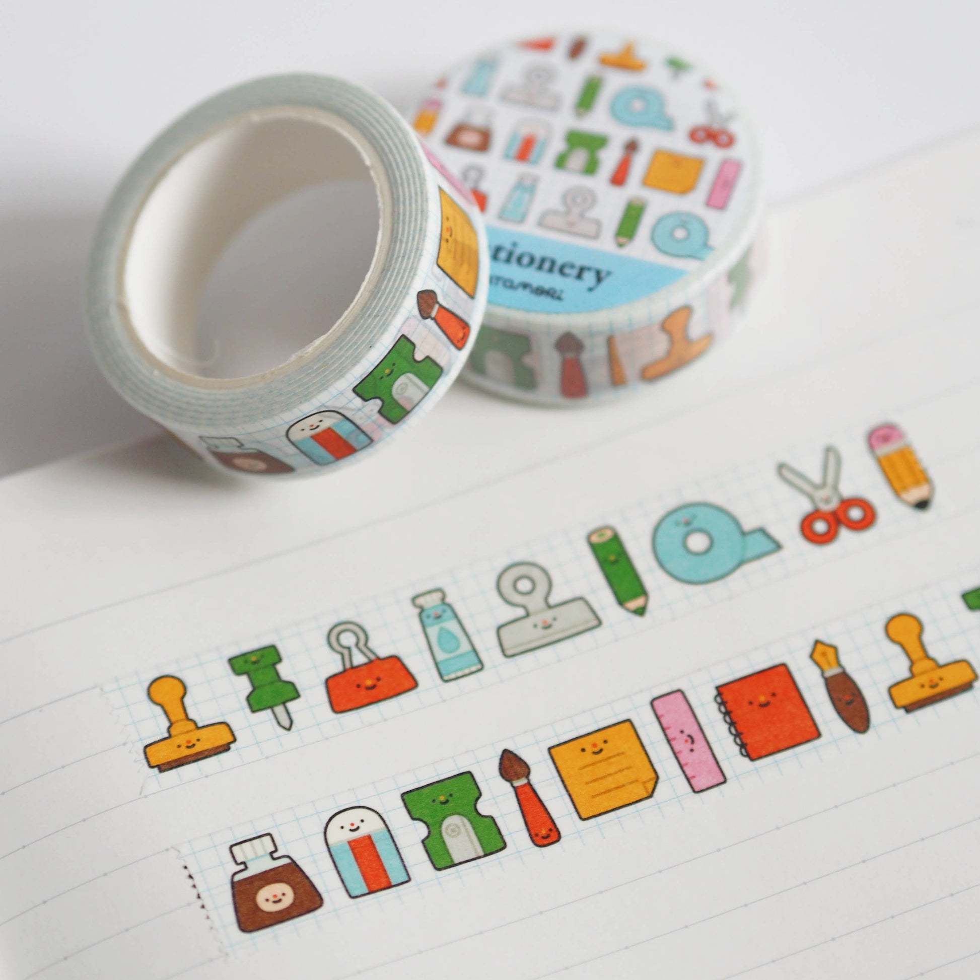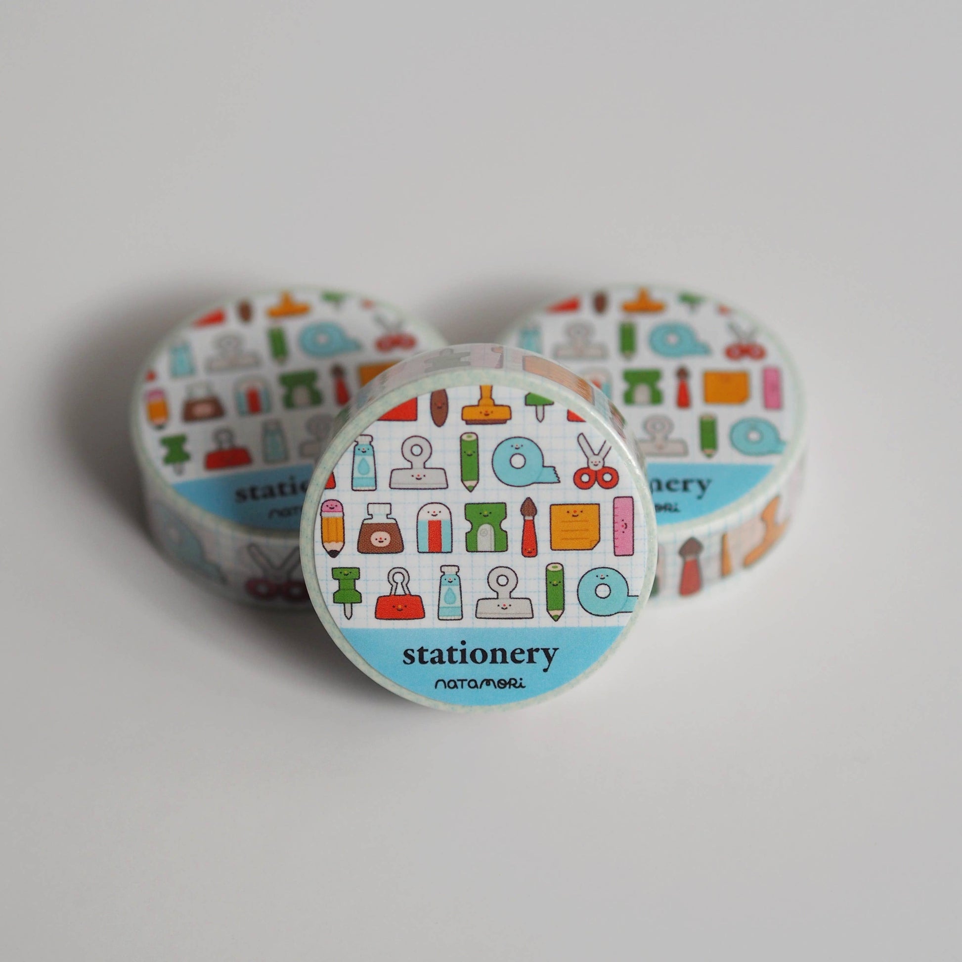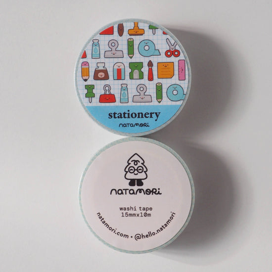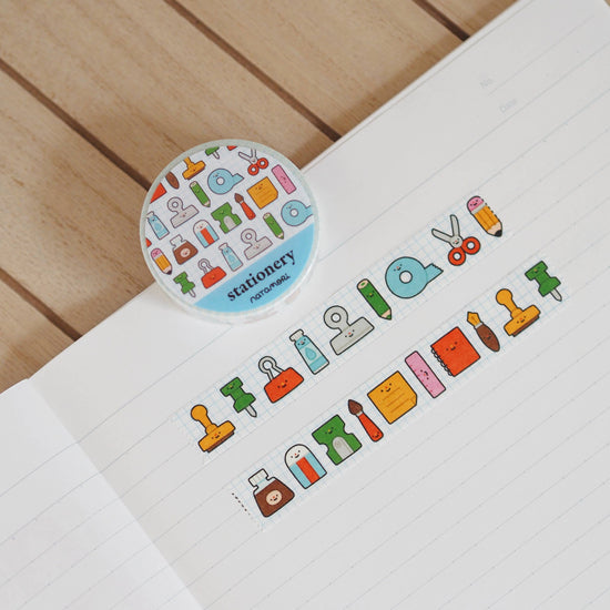 Un ruban washi joyeux et délicatement illustré, pensé comme une véritable ode à la papeterie. Tampons, ciseaux, carnets, crayons et petits accessoires souriants se succèdent tout au long du ruban, dans l’univers tendre et ludique propre à Natamori.