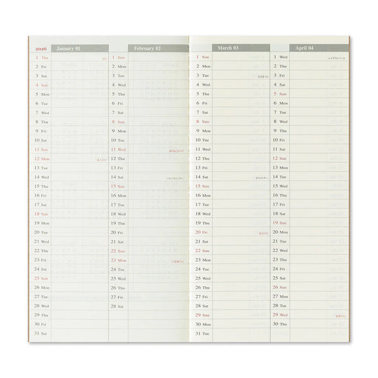Type : Agenda hebdomadaire + page mémo – daté (janvier à juin et juillet à décembre 2026)