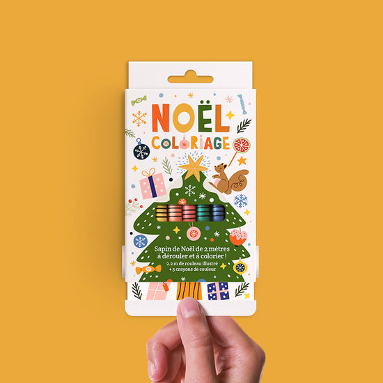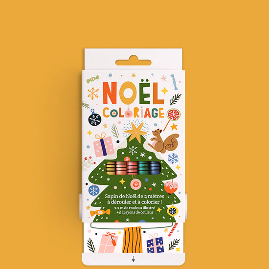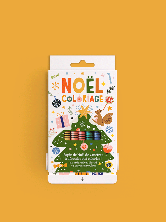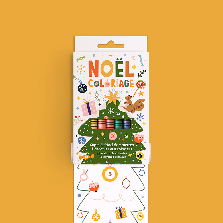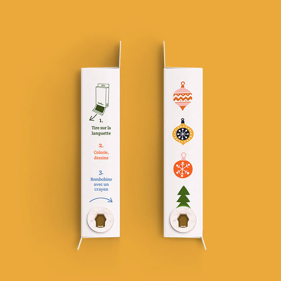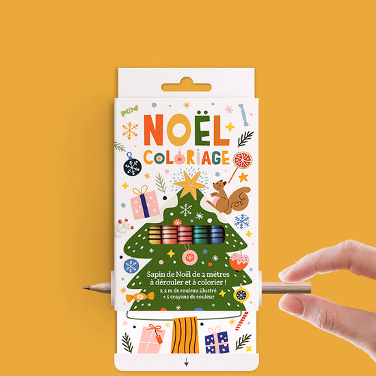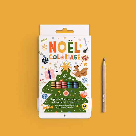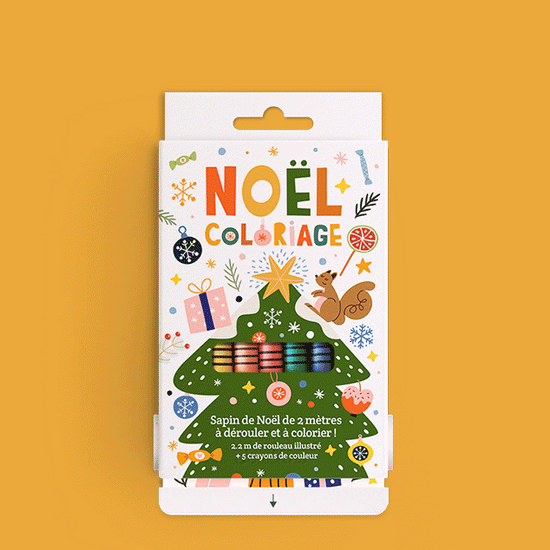 À l’intérieur de cette petite boîte de papier ingénieuse se cache une bande de 2 mètres de dessins à colorier : un grand sapin de Noël et des illustrations festives qui se dévoilent chaque jour, à votre rythme.