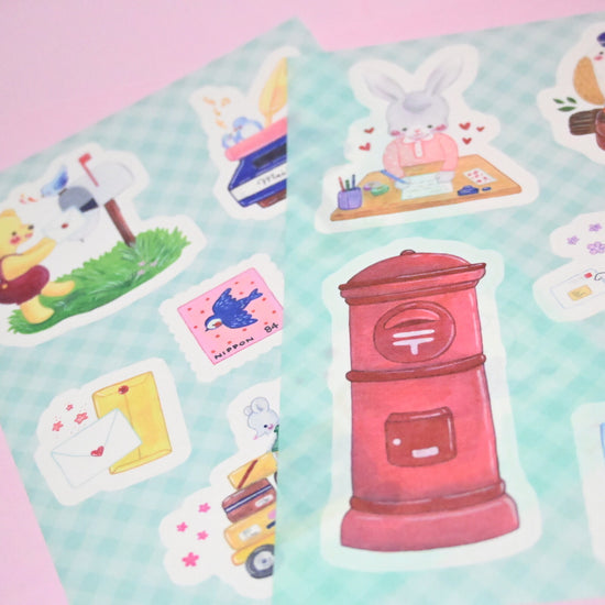 Sur une grande planche format A5, découvrez des stickers en papier japonais aux textures et motifs inspirés des enveloppes, timbres, rubans et petits mots d’amitié.