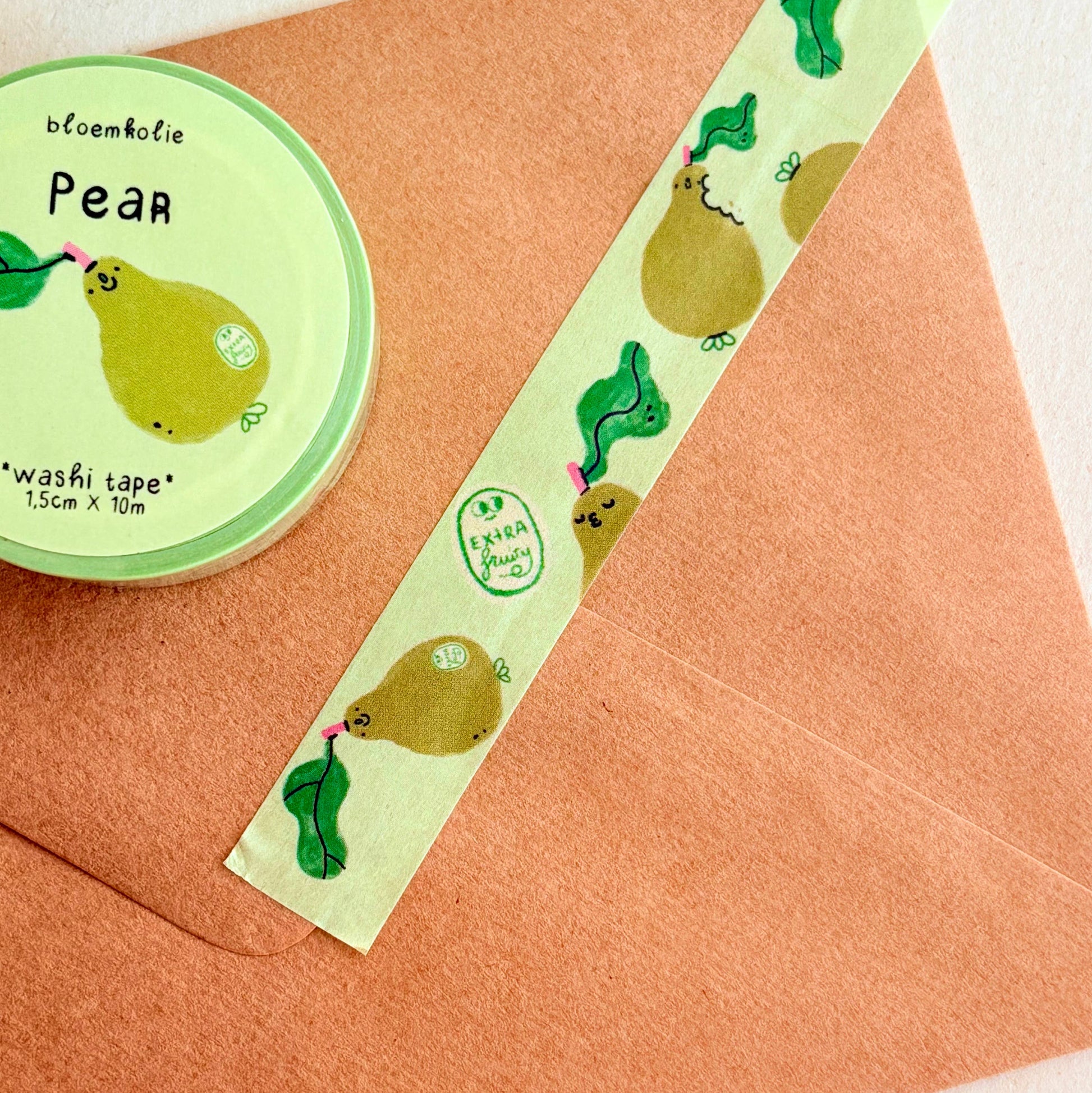 Doux comme une poire mûre au soleil, ce washi tape fruité apporte une note de fraîcheur à vos carnets et créations. Ses petites poires aux tons tendres et lumineux évoquent les goûters d’été et les marchés colorés, pour un quotidien un peu plus joyeux et sucré.