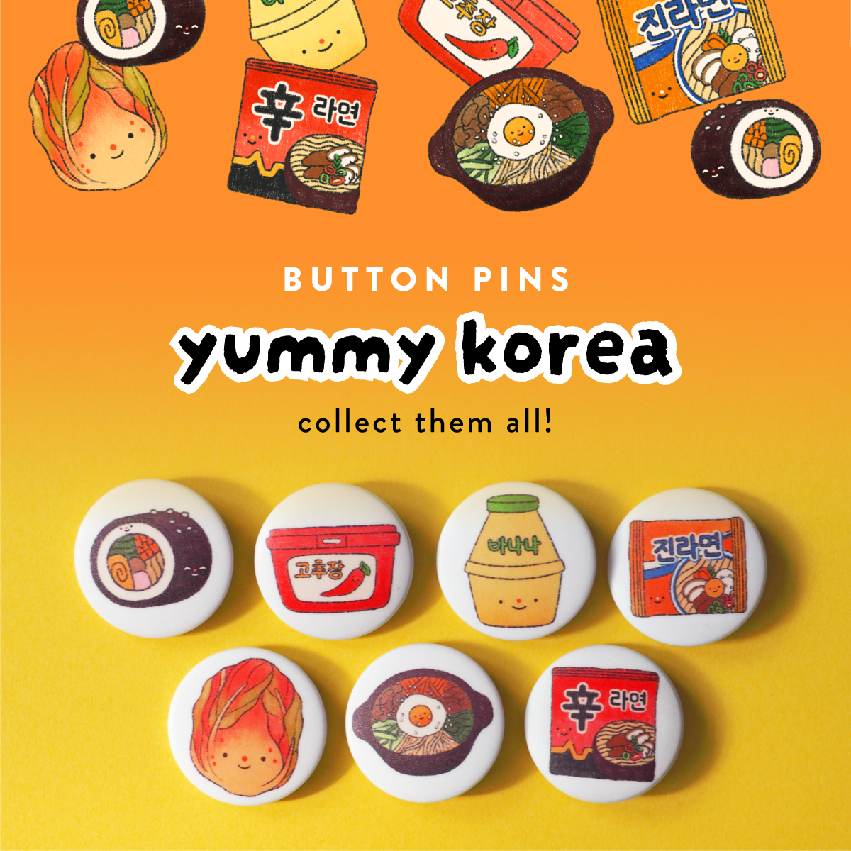 Un pin’s joyeux et graphique, directement inspiré de l’univers Yummy Korea. Avec ses illustrations gourmandes et adorable, ce button pin est parfait pour apporter une touche de couleur et de personnalité à une veste, un sac, une trousse ou un tableau en liège.
